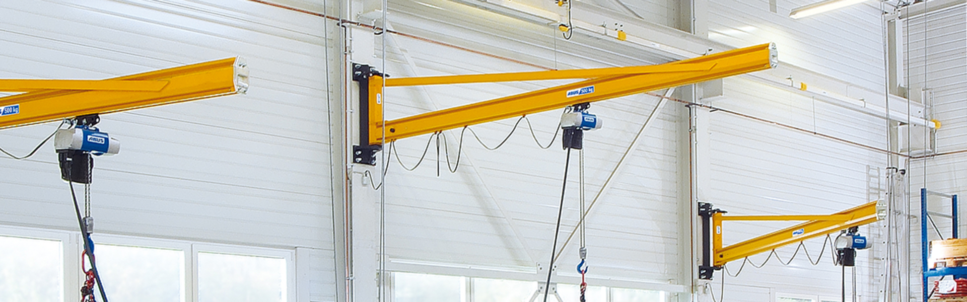 The wall jib crane LW has been designed to be mounted on a wall or column. This workstation crane provides a slew range of 180° with jib arm lengths of up to 7 m and Safe Working Loads (SWL) of up to 1.0 t.