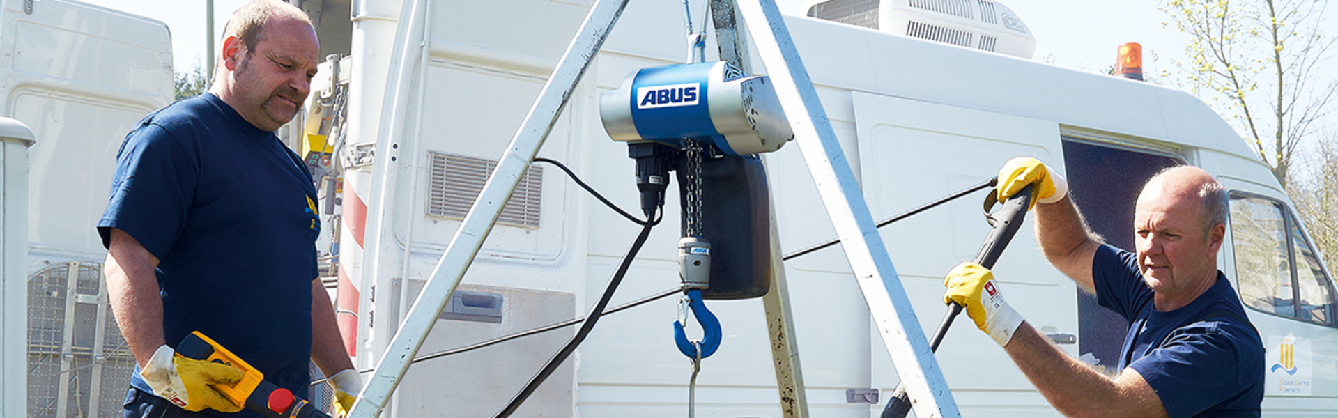 A standard power socket with 230 V suffices for the power supply of the ABUCompact GMC. The GMC is particularly suited to mobile use due to its low weight. The GMC is available with single or double falls and is able to lift loads of up to 125 kg / 250 kg. The lifting speed is infinitely variable. Feasible hook paths reach lengths of up to 20 m / 10 m.