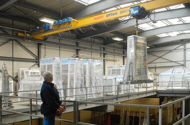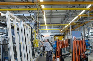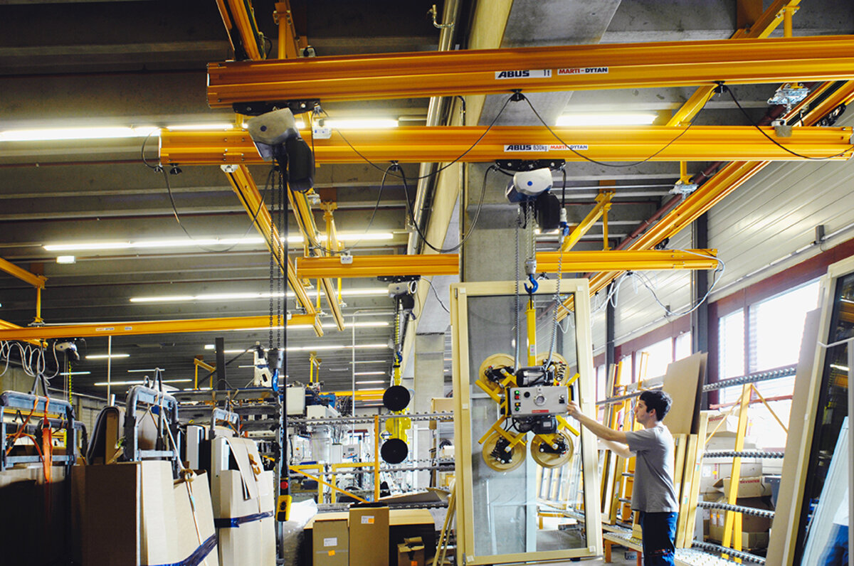 The high quality standards of EgoKiefer AG are also applied to the production processes which are continually optimised. When it comes to the conception of the systems for the internal transport and the material transport EgoKiefer have relied on the company Marti-Dytan AG (www.brunmartidytan.ch) with headquarters at Horw-Luzern for many years. Marti-Dytan is the Swiss distributor for ABUS crane systems. Once specialised engineers of Marti-Dytan had analysed in detail the requirements of EgoKiefer they advised them to install four ABUS single girder cranes type EHB with load capacities of 500 kg each from the ABUS product range of suspended rail systems. This modular HB system is capable to fit almost all shapes and sizes of rooms and halls and is able to lift up to 2 tonnes of loads when fitted with ABUS electric chain hoists. EgoKiefer AG continuously operate these HB systems in connection with suction lifters to handle the windows in their production plant. For logistic purposes they use ABUS single girder cranes type ELK with load capacities of 2.5 tonnes to load and unload lorries. The load hooks of the EOT cranes have been fitted with automatic catch and opening systems. The cranes are also frequency controlled that allow sensitive loads to be offloaded and positioned precisely when using reduced speeds. The EOT cranes are operated via radio remote control to enable the crane user to keep an eye on the whole area of the loading zone from a safe distance. Mr Hans Beutler, head of technical services at EgoKiefer AG, stressed that adding safety to the system was very important to the company, but they were also pleased with the improved design layout of the material handling system which had been achieved perfectly with the ABUS crane systems.