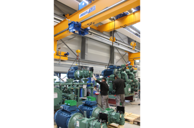 Loads of up to 2 tonnes were dealt with in the previously existing buildings; however, the new site challenges the lifting and crane technology now to handle loads of up to 12 tonnes: that is how much the heaviest BITZER ACPs can weigh once they are fully packaged. The objective for the new plant had been to be able to handle these complete loads on site. They wanted to be able not only to transport the individual components weighing up to 2 tonnes during assemblage but also to carry out the ensuing transport of the finished products on site. This required all crane tracks to be arranged on two levels in order to use all cranes on the same site. It had also to be possible to use all cranes independently of each other. Thus two single girder wall travelling cranes EWL with 3.2 tonnes SWL and spans of 8 metres are used in the plant with an ABUS double girder EOT crane ZLK travelling above them. This ZLK crane has a load capacity of 16 / 8 tonnes, features two hoists, and has a span of 19.26 metres. The single girder wall travelling cranes running on the lower level really come into their own during final assemblage: they are used to lift the larger components such as electric motors, compressors, and oil separators and to transport them to the allocated sites in order to be fitted into the metal frames of the corresponding ACPs by the employees. As the wall travelling cranes are travelling along the walls it is it possible to use one of these cranes to serve several workstations. The cranes are controlled via push button pendants. This allows the individual components to be positioned very precisely. Overload protection as well as collision prevention devices for cranes and hoists ensure maximum safety for crane users and for the material to be handled.