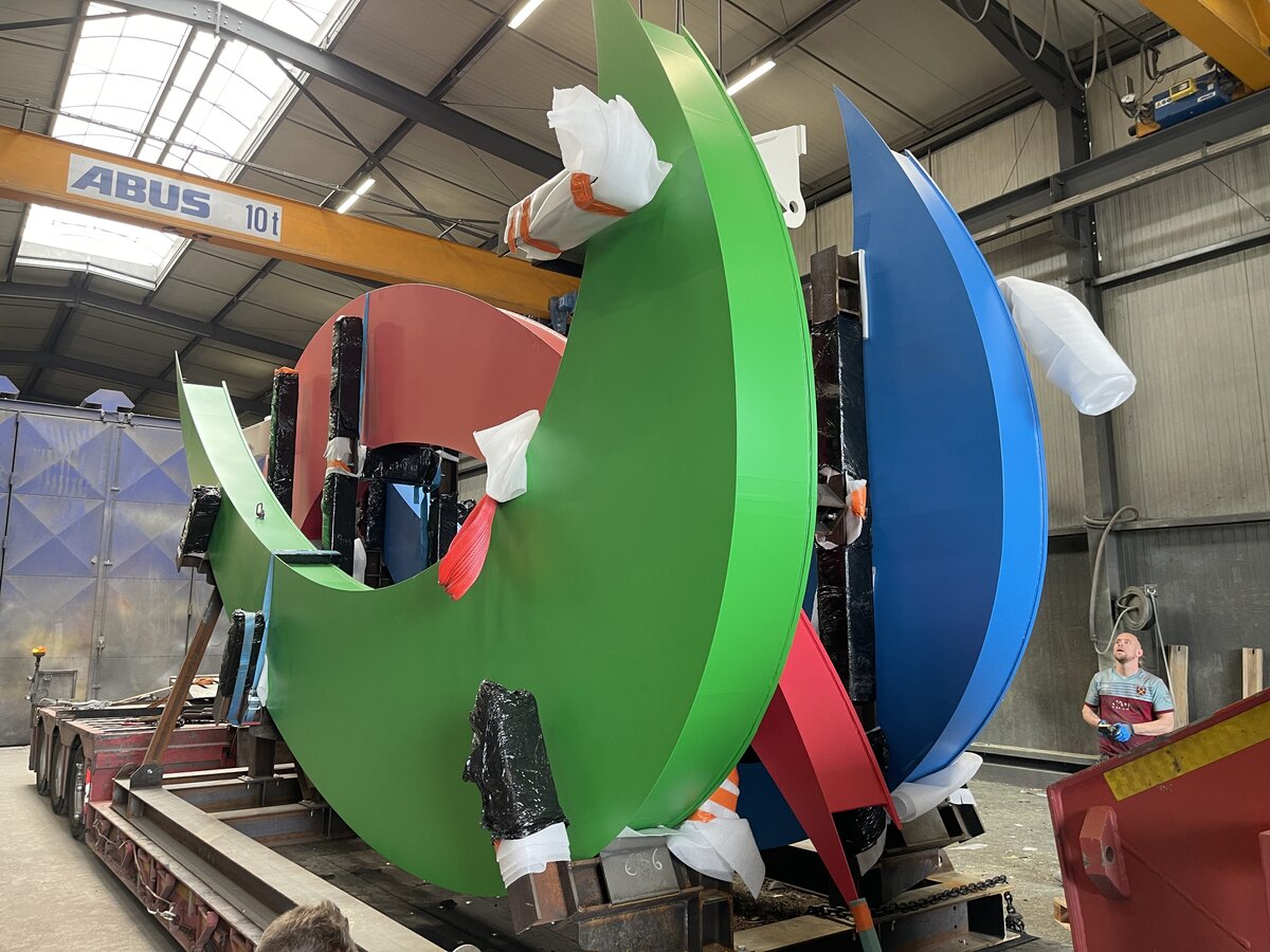 The monumental structures were delivered to Chiarizia's workshops in eleven segments, each measuring 8 x 3 meters and weighing between 1.4 and 3.5 tons per element. Once assembled, the entire installation measured an impressive 29 meters wide and 13 meters high.