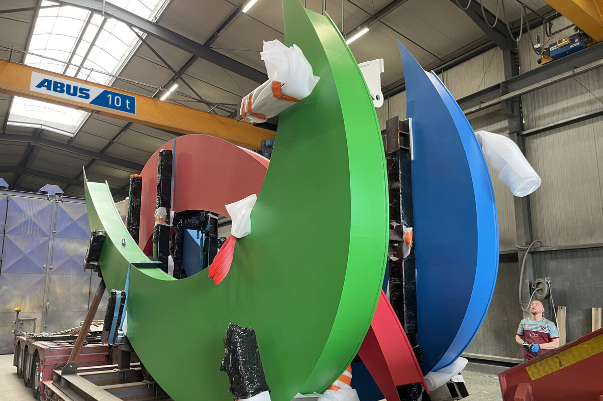 The monumental structures were delivered to Chiarizia's workshops in eleven segments, each measuring 8 x 3 meters and weighing between 1.4 and 3.5 tonnes per section. Once assembled, the entire installation measured an impressive 29 meters wide and 13 meters high.