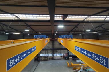 - Two double-girder overhead travelling cranes equipped with twin electric wire rope hoists. Each hoist can lift up to 10 tonnes when the load is positioned in the centre of the crane. Due to the structure of the hall, the maximum capacity outside the marked zones is limited to 8 tonnes per hoist. This configuration allows both long and heavy components to be handled safely while maintaining flexibility in the workspace.